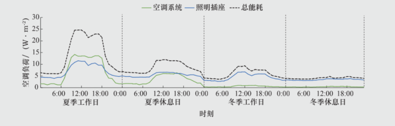 再選取典型日負(fù)荷曲線看,照明插座、動力用電和特殊用電受季節(jié)的影響較小,而空調(diào)用電負(fù)荷則有明顯的季節(jié)差異性。以政府辦公建筑類型為例(其典型日負(fù)荷曲線見圖1),其夏季空調(diào)用電量占比高達(dá)40%,而冬季不到10%。如果能夠充分挖掘空調(diào)系統(tǒng)的靈活性,一方面配置蓄冷、蓄冰、蓄電等儲能設(shè)施,另一方面結(jié)合建筑的用能需求和負(fù)荷特性優(yōu)化空調(diào)的運(yùn)行調(diào)度策略,則有可能大幅降低夏季空調(diào)的負(fù)荷峰值。