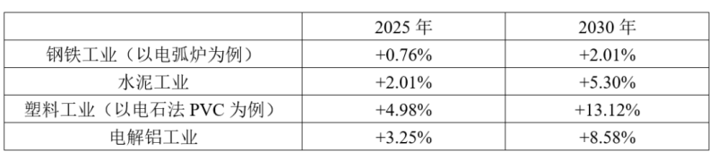 結(jié)果表明,2030年預(yù)測(cè)工業(yè)電價(jià)將對(duì)我國(guó)水泥工業(yè),電石法生產(chǎn)PVC的塑料行業(yè),以及電解行業(yè)造成顯著影響,導(dǎo)致其用電負(fù)擔(dān)分別上升5.30%,13.12%和8.58%。