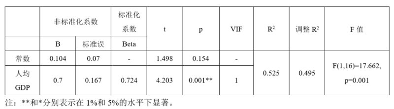 模型2在模型1的基礎(chǔ)上加入人均GDP后,F(xiàn)值變化沒(méi)有呈現(xiàn)出顯著性(ΔF=3.922, Δp=0.066>0.05),意味著人均GDP加入后對(duì)模型不具有解釋意義。