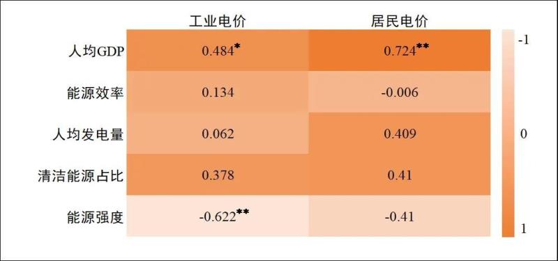 根據(jù)Pearson相關(guān)性分析結(jié)果,工業(yè)電價(jià)與人均GDP和能源強(qiáng)度之間相關(guān)關(guān)系顯著。工業(yè)電價(jià)與人均GDP之間的相關(guān)系數(shù)值為0.484,并且呈現(xiàn)出0.05水平的顯著性,說(shuō)明工業(yè)電價(jià)和人均GDP之間有著顯著的正相關(guān)關(guān)系;工業(yè)電價(jià)和能源強(qiáng)度之間的相關(guān)系數(shù)值為-0.622,并且呈現(xiàn)出0.01水平的顯著性,說(shuō)明工業(yè)電價(jià)和能源強(qiáng)度之間有著顯著的負(fù)相關(guān)關(guān)系。