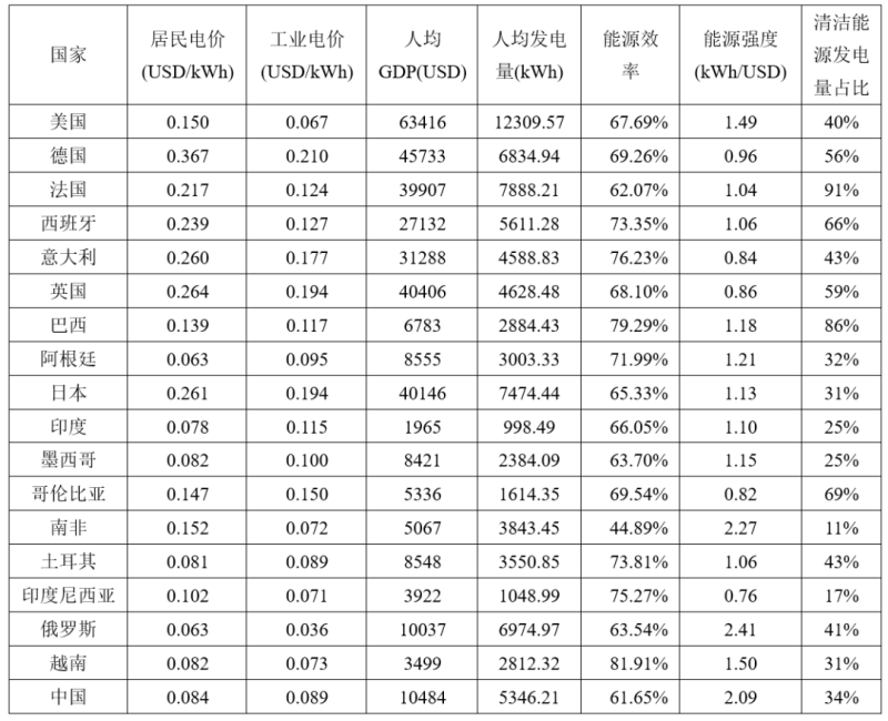 為探究電力市場(chǎng)的發(fā)展規(guī)律,篩選出與電價(jià)較為相關(guān)的影響因素,我們以中國(guó),部分電力市場(chǎng)發(fā)展成熟的歐美發(fā)達(dá)國(guó)家,以及與中國(guó)產(chǎn)業(yè)結(jié)構(gòu)相似的制造業(yè)國(guó)家等共計(jì)18個(gè)國(guó)家為研究對(duì)象,選擇了人均GDP,能源效率,人均發(fā)電量,清潔能源占比,能源強(qiáng)度等因素作為自變量,工業(yè)電價(jià)和居民電價(jià)作為因變量開(kāi)展Pearson相關(guān)性分析。各個(gè)國(guó)家的原始數(shù)據(jù)見(jiàn)表1,Pearson相關(guān)分析結(jié)果見(jiàn)圖12。