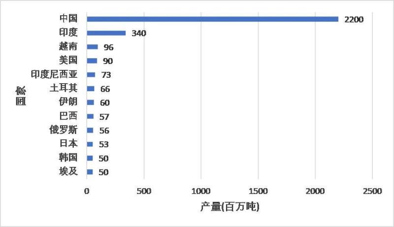 圖8 2020年世界主要水泥生產(chǎn)國(guó)產(chǎn)量,數(shù)據(jù)來(lái)自statista