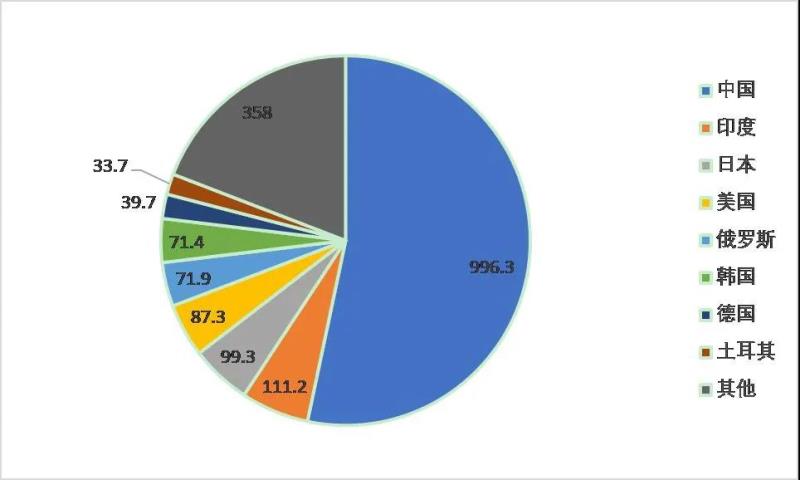 圖7 2019年世界主要鋼鐵生產(chǎn)國(guó)鋼鐵產(chǎn)量占比,單位:百萬(wàn)噸,數(shù)據(jù)來(lái)自worldsteel