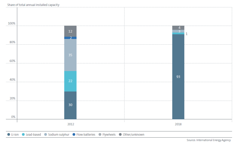 在所有可用電池中,鋰電池占據(jù)主要的市場地位,除PSH以外,鋰離子技術(shù)的變體占新能源存儲(chǔ)裝置的90%以上,而飛輪和超級(jí)電容器等短期技術(shù)則低于2%。
