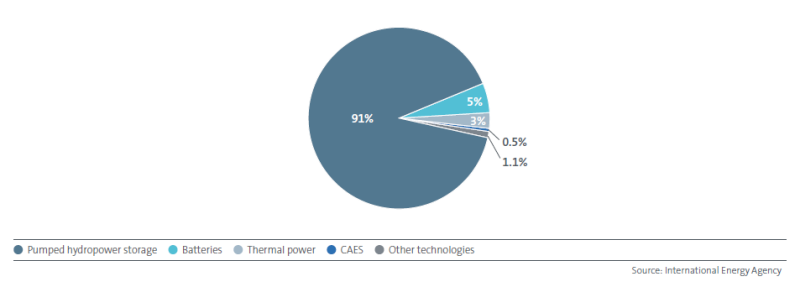 全球電力總存儲(chǔ)容量不足200GWh,其中抽水蓄能發(fā)電(PSH)占90%以上,而電池僅占不到3%。但是PSH技術(shù)的發(fā)展受站點(diǎn)位置、長時(shí)間工期等因素限制。相反,電池在固定式能量存儲(chǔ)應(yīng)用中的使用呈指數(shù)增長。