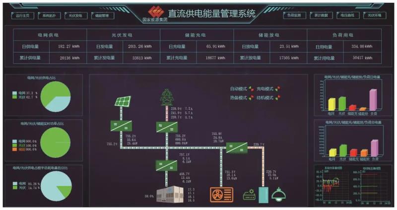 項目配備電能管理系統(tǒng),對直流電能和發(fā)用電設備進行監(jiān)測、控制。主要完成監(jiān)測發(fā)用電設備運行狀態(tài)、存儲和分析運行數(shù)據(jù)、優(yōu)化調度電能等功能,實現(xiàn)光伏發(fā)電利用最大化,削峰填谷等目標。直流供電能量管理系統(tǒng)運行界面如圖4所示。