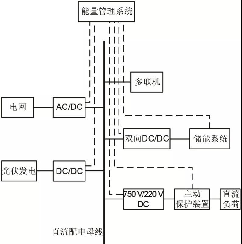 項目的低壓直流供電系統(tǒng)總負荷100 kW,采用兩級配電系統(tǒng),第一級配電為750 V單極母線,市電整流后接入母線,光伏系統(tǒng)通過光伏MPPT變換器接入,儲能蓄電池經雙向變換器接入,該母線同時為多聯(lián)機等供電;第二級配電為單極220 V,為照明、電腦、云平臺服務器、家用電器等供電。