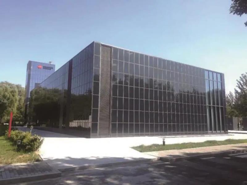 該建筑是光伏建筑一體化技術和低壓直流供電技術的研究、實驗及綜合示范項目,位于北京市昌平區(qū)。立面幕墻和屋面安裝銅銦鎵硒薄膜光伏組件,裝機容量112.6 kWp,使用PVSyst軟件預測首年發(fā)電量約7.5萬千瓦時。建筑建成后外觀如圖1所示。