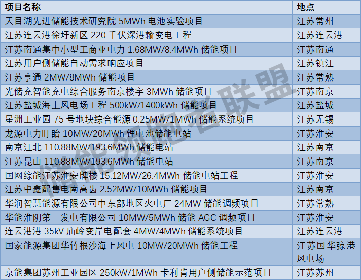 2020年江蘇省儲(chǔ)能項(xiàng)目匯總?cè)缦拢?
