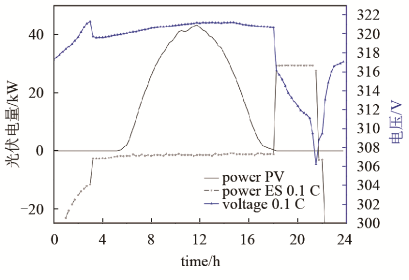 將篩選并成組后的退役動(dòng)力鋰電池應(yīng)用于光儲(chǔ)微電網(wǎng)系統(tǒng)中,設(shè)置電池放電倍率為0.1 C,充電倍率為0.05 C,并依據(jù)當(dāng)?shù)胤骞入妰r(jià)時(shí)段進(jìn)行充放電,實(shí)現(xiàn)削峰填谷,運(yùn)行結(jié)果如圖8所示。