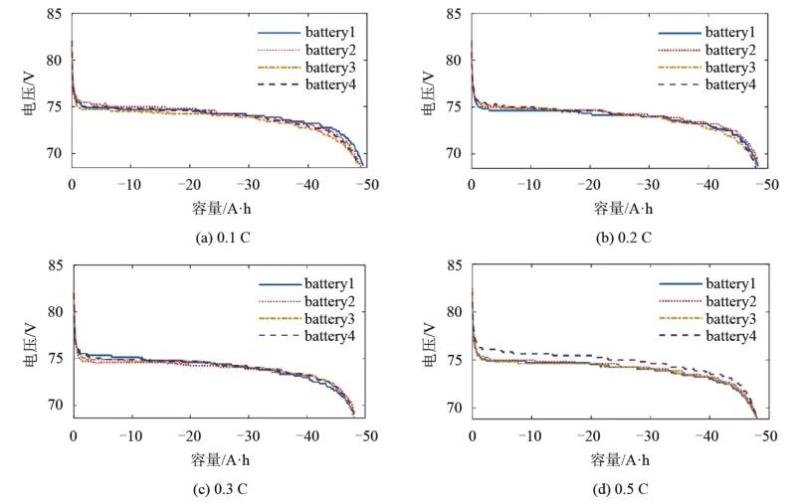 在不同倍率下對(duì)電池組進(jìn)行多個(gè)循環(huán)周期的恒功率充放電,利用電池管理系統(tǒng)記錄每組中各個(gè)電池包的放電容量及電壓值,得到電池的CD-OCV曲線,根據(jù)曲線的離散情況對(duì)電池成組配組情況進(jìn)行驗(yàn)證。