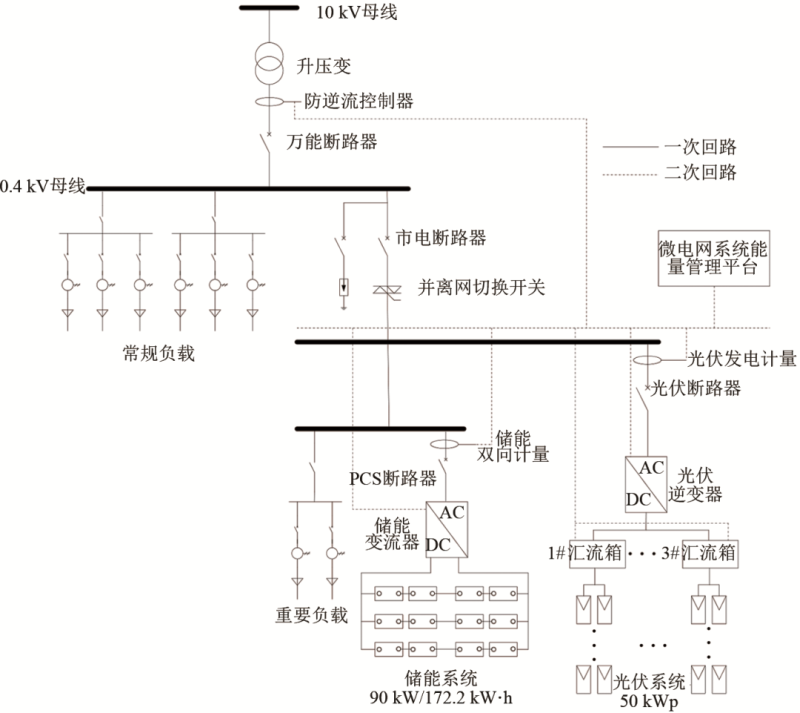 將90 kW/172.8 kW·h儲(chǔ)能系統(tǒng)同50 kWp分布式光伏系統(tǒng)在交流側(cè)并聯(lián),并通過(guò)快速并離網(wǎng)切換開(kāi)關(guān)接入到廠區(qū)0.4 kV交流母線上,構(gòu)成光儲(chǔ)微網(wǎng)系統(tǒng)。其中,分布式光伏系統(tǒng)采用單晶硅組件,串聯(lián)后經(jīng)過(guò)直流匯流箱接入到組串式光伏逆變器中,與儲(chǔ)能系統(tǒng)在交流側(cè)耦合。儲(chǔ)能變流器的交流輸出端同時(shí)關(guān)聯(lián)部分重要負(fù)載,在市電異常時(shí),由光儲(chǔ)系統(tǒng)保障重要負(fù)載的供電。光儲(chǔ)系統(tǒng)拓?fù)鋱D如圖6所示。
