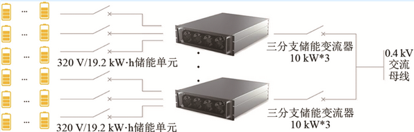 選用多通道儲(chǔ)能變流器作為光儲(chǔ)電站中的交直流轉(zhuǎn)換設(shè)備,其具有DC/DC+DC/AC兩級(jí)式拓?fù)浣Y(jié)構(gòu),在電池端無(wú)并聯(lián),可以避免電池組間環(huán)流的產(chǎn)生,適用于對(duì)退役電池進(jìn)行成組。將配組完的80 V-60 A·h電池包4個(gè)組成一串,形成320 V/19.2 kW·h儲(chǔ)能單元,接入到30 kW儲(chǔ)能變流器的一個(gè)直流通道,單個(gè)通道功率10 kW。整個(gè)儲(chǔ)能系統(tǒng)共9個(gè)直流通道,儲(chǔ)能容量90 kW/172.8 kW·h。系統(tǒng)結(jié)構(gòu)如圖5所示。