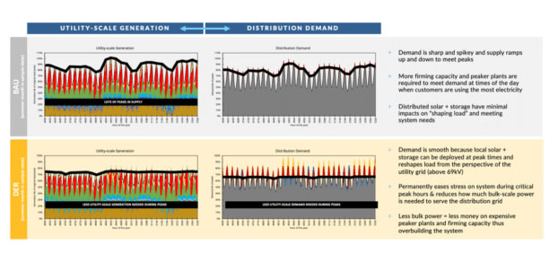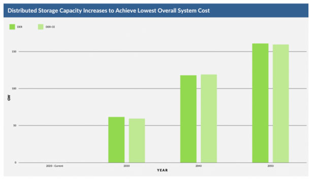 該模型發(fā)現(xiàn),通過在配電水平和更接近客戶負(fù)荷的水平上增加本地太陽能和儲能系統(tǒng)的部署,不必像許多傳統(tǒng)規(guī)劃師所設(shè)想的那樣過度依賴輸電系統(tǒng)中化石燃料發(fā)電設(shè)施,也不必低估配電系統(tǒng)的利用率。這些分布式能源(DER)有效地重塑了大型電網(wǎng)的負(fù)荷,降低了大容量電力系統(tǒng)的成本,并平滑了整個系統(tǒng)負(fù)荷的波動和變化。到2050年,通過增加247GW的分布式太陽能和160GW的分布式儲能系統(tǒng),這可以實現(xiàn)更有效的總體投資分配以及使本地電力系統(tǒng)更靈活。