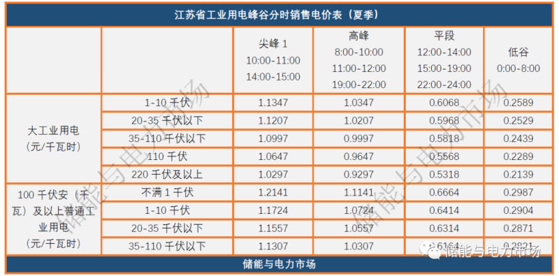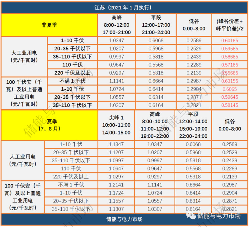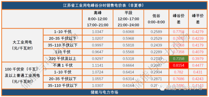 2020年11月3日,江蘇省發(fā)改委發(fā)布了《關(guān)于江蘇電網(wǎng)2020-2022年輸配電價(jià)和銷(xiāo)售電價(jià)有關(guān)事項(xiàng)的通知》。根據(jù)通知的內(nèi)容,江蘇省峰谷價(jià)差最大為0.8154,最低為0.7158(如下表)。