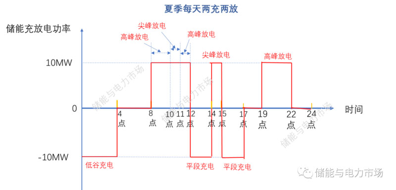 夏季,每天低谷0-4點(diǎn),平段12-14點(diǎn),15-17點(diǎn)充電,總共充電8小時(shí),每天高峰8-10點(diǎn)、11-12點(diǎn)、19-22點(diǎn),以及尖峰10-11點(diǎn)、14-15點(diǎn)放電,總計(jì)放電8小時(shí)。