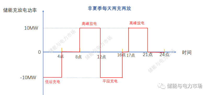非夏季,每天低谷0-4點(diǎn),平段12-16點(diǎn)各充電4小時(shí),總計(jì)充電8小時(shí)。每天高峰8-12點(diǎn),17-21點(diǎn)各放電4小時(shí),總計(jì)放電8小時(shí)。