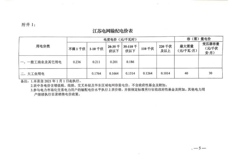 三、為應(yīng)對新冠疫情影響,今年國家實施階段性降低企業(yè)用電成本政策,本年度繼續(xù)執(zhí)行現(xiàn)行輸配電價和銷售電價。本通知所附江蘇電網(wǎng)輸配電價和銷售電價自2021年1月1日起執(zhí)行。