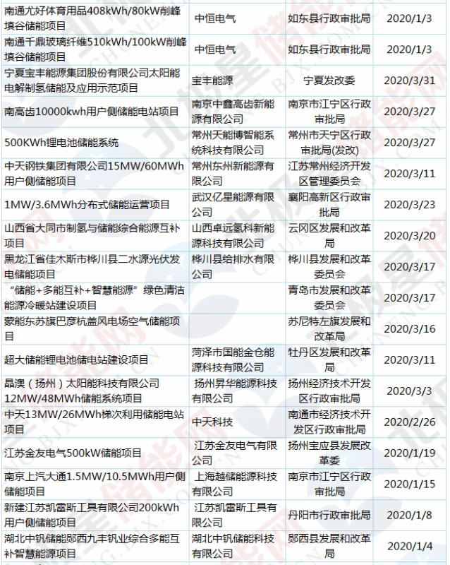 據(jù)北極星儲能網(wǎng)統(tǒng)計,2020年1季度已有37個儲能項(xiàng)目通過備案,絕大部分為用戶側(cè)削峰填谷項(xiàng)目,總規(guī)模預(yù)計超170MWh。其中26個儲能項(xiàng)目位于江蘇省,規(guī)模最大的為位于常州中天鋼鐵集團(tuán)的15MW/60MWh儲能項(xiàng)目。