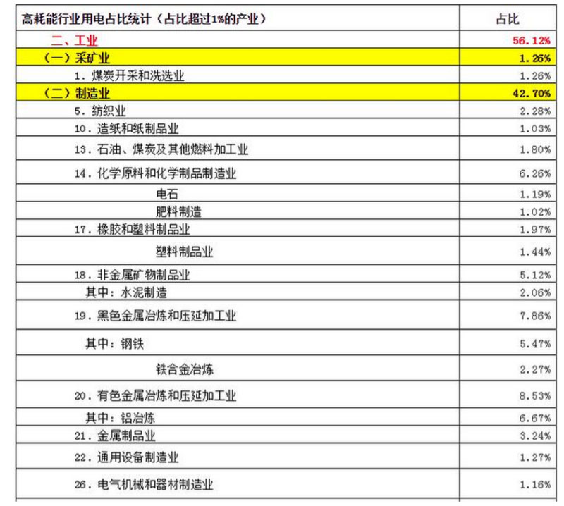 用電量占比超過2%的工業(yè)行業(yè)如下表: