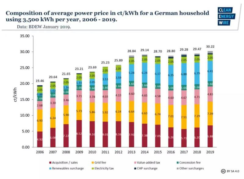 2019年德國居民電價30.22歐分/千瓦時(約合人民幣2.37元/千瓦時),其中包含可再生能源附加費(fèi)(6.41歐分/千瓦時,約合人民幣0.5元/千瓦時),占到居民電價的21%。