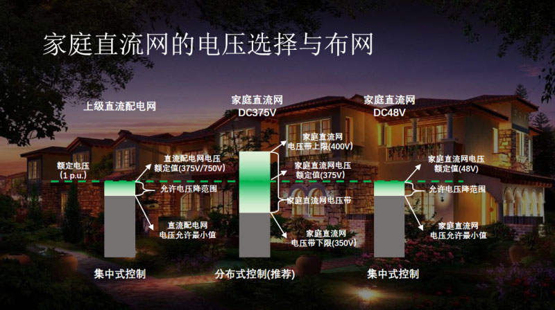 這是對(duì)三級(jí)電網(wǎng)建議的電壓的選擇,對(duì)于最外層的上級(jí)直流配電網(wǎng)選擇375或者750是一個(gè)定電壓控制,是集中式的控制,所以它有一個(gè)較小的允許電壓降范圍,通常是以額定功率和線路阻抗來設(shè)計(jì)的,我們目前設(shè)計(jì)的是1.4%的電壓下降。中間這一級(jí)是375家庭直流網(wǎng),與上級(jí)的直流配電網(wǎng)連接。為什么這里用一個(gè)帶有電壓帶的方式呢?是因?yàn)樵谶@一級(jí)家庭直流網(wǎng)中我們通常會(huì)接入大量的光伏、儲(chǔ)能,所以它不再適用于集中式的控制,會(huì)選擇分布式的控制,我們會(huì)為它預(yù)留一些下垂控制的范圍,我們把它叫做電壓帶,它的電壓帶上限是400V,下限350V。