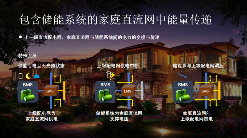 這里選擇400V的原因是因?yàn)樗枰獫M足國(guó)際電氣聯(lián)盟的標(biāo)準(zhǔn),因?yàn)樵谶@個(gè)標(biāo)準(zhǔn)里面規(guī)定所有的家用電器的電壓帶需要范圍是在400V以下。在家庭直流網(wǎng)中由于成本的要求,構(gòu)建一個(gè)獨(dú)立的能量管理和協(xié)同控制系統(tǒng)是并不合適的,像同里綜合能源中心那種大型的直流網(wǎng)中會(huì)有獨(dú)立的協(xié)控系統(tǒng)還有能量管理系統(tǒng),對(duì)于更次一級(jí)的家庭納網(wǎng)這種架構(gòu)是不太適用的,它需要一個(gè)更低成本、更簡(jiǎn)化的架構(gòu)方式。而儲(chǔ)能自身的EMS系統(tǒng)就特別適合作為這么一個(gè)中心控制器,因?yàn)樗挠布强梢詽M足這些需求的。