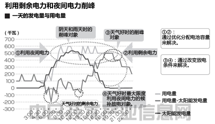 在太陽(yáng)能發(fā)電量較多、電力有剩余時(shí),將電能存儲(chǔ)在蓄電池中,在電力不足時(shí)加以利用。并且,在預(yù)計(jì)會(huì)出現(xiàn)陰天及下雨天時(shí),事先利用電價(jià)較低的夜間電力蓄電,在白天電力需求較大時(shí)加以利用。