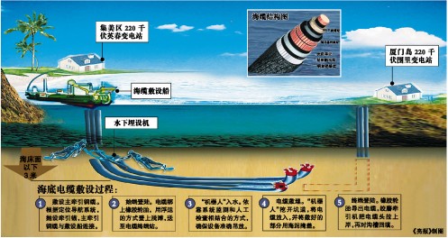 “這一工程中采用的電纜,直徑超過17厘米,足足有成年人的大腿那么粗,是目前國內最粗的電纜。而且很重,每米電纜就有87千克。”負責該項目施工的廈門電業(yè)局基建工程師江慧聰告訴記者。
