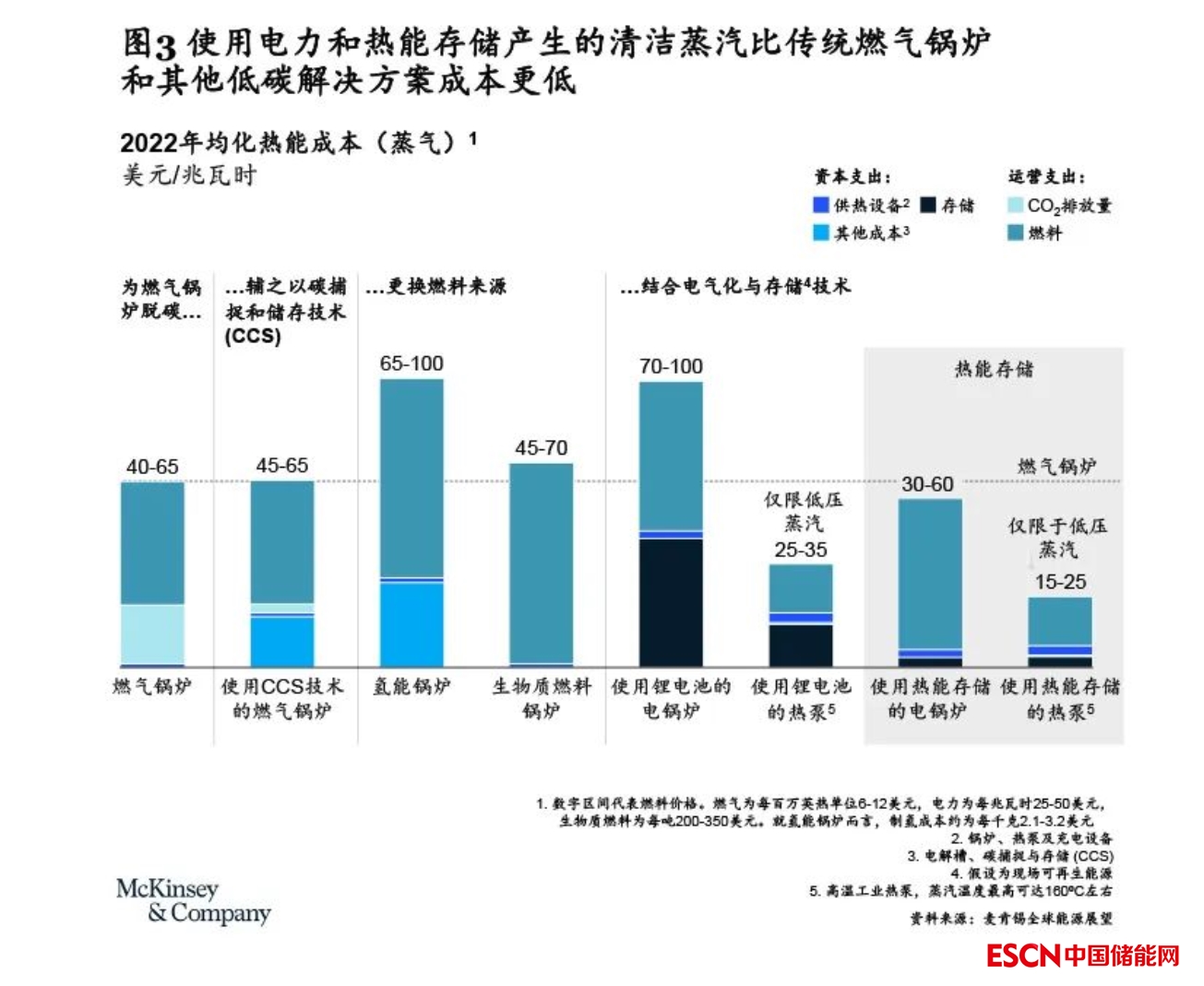 儲(chǔ)熱有助于實(shí)現(xiàn)經(jīng)濟(jì)高效的清潔熱能供應(yīng)?!秲袅銦崮軋?bào)告》顯示,根據(jù)2022年長(zhǎng)時(shí)儲(chǔ)能理事會(huì)的成本對(duì)標(biāo)結(jié)果,對(duì)于工業(yè)過(guò)程中最常見(jiàn)的蒸汽或熱空氣這兩種熱能形式,儲(chǔ)熱已經(jīng)可以提供具有成本競(jìng)爭(zhēng)力的電氣化與脫碳解決方案。如圖3所示,在燃?xì)忮仩t脫碳的應(yīng)用中,相比燃?xì)忮仩t疊加碳捕捉與存儲(chǔ)技術(shù)、氫能鍋爐、生物質(zhì)鍋爐、結(jié)合鋰電儲(chǔ)能的電鍋爐或熱泵等脫碳選項(xiàng),結(jié)合了儲(chǔ)熱系統(tǒng)的電鍋爐或熱泵更具經(jīng)濟(jì)性。