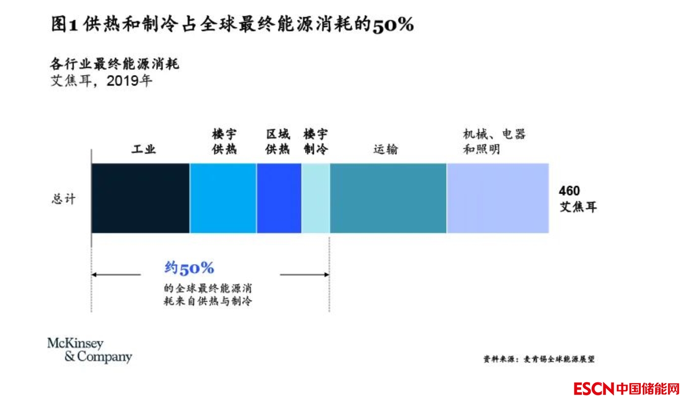 隨著全球能源系統(tǒng)脫碳的不斷推進(jìn),人們的視線(xiàn)也逐漸轉(zhuǎn)移到最重要也最難脫碳的介質(zhì)之一——熱能。熱能主要應(yīng)用于工業(yè)生產(chǎn)、樓宇供熱/制冷和區(qū)域供暖,在全球終端能源消耗中的占比已超過(guò)50%(見(jiàn)圖1)。由于目前大多數(shù)熱能的來(lái)源仍是化石燃料,供熱與制冷占到了全球能源相關(guān)碳排放【1】的45%,加速熱能脫碳對(duì)實(shí)現(xiàn)凈零排放至關(guān)重要。