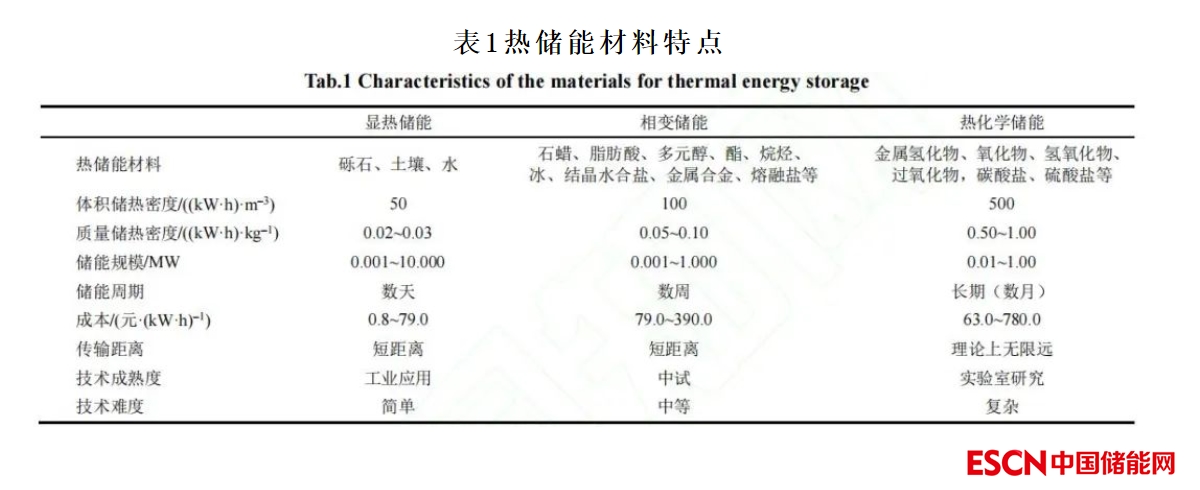 熱儲能是指將熱能儲存在特定的介質中,并在需要時轉化為電能或其他形式能源的技術。表1對比了顯熱儲能、相變儲能、熱化學儲能材料的特點。