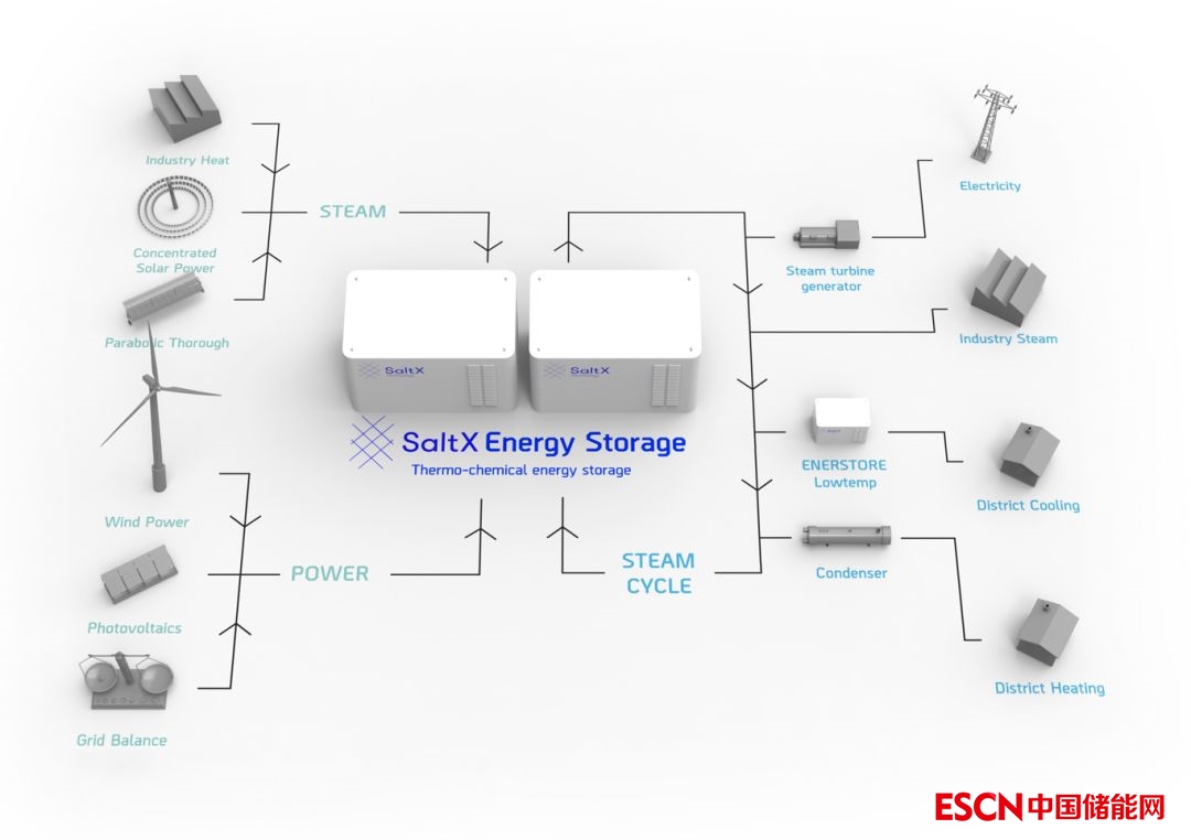 SaltX Technology熱化學(xué)儲(chǔ)能系統(tǒng)是一個(gè)強(qiáng)大的工業(yè)系統(tǒng),內(nèi)置帶納米涂層的鹽晶體。鹽晶體通過電或熱源進(jìn)行加熱以存儲(chǔ)能量,放熱時(shí)則會(huì)釋放出蒸汽,這些蒸汽可用于多種工業(yè)用途。