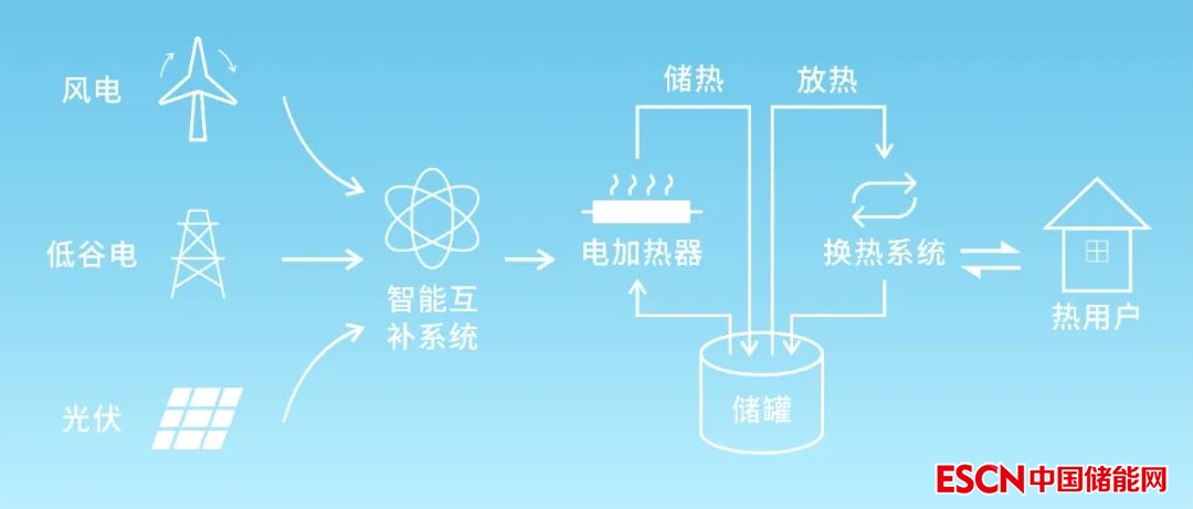一方面,采用智能互補(bǔ)系統(tǒng)將風(fēng)電、光伏、夜間低谷電等作為能量源,通過電加熱器加熱熔鹽,儲(chǔ)存熱量;另一方面,在換熱系統(tǒng)中高溫熔鹽與水進(jìn)行換熱,釋放熱量。為了讓大家更直觀地理解,小e給大家做了一張?jiān)韴D。