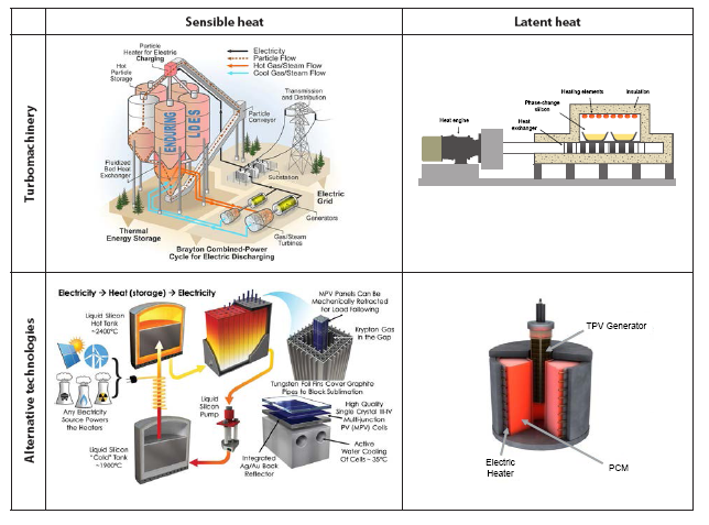 對(duì)于顯熱或潛熱系統(tǒng),基于渦輪機(jī)械的設(shè)計(jì)通常將技術(shù)風(fēng)險(xiǎn)限制在將儲(chǔ)能系統(tǒng)連接到渦輪機(jī)械的熱交換器以及與能源相關(guān)的組件上。然而,在啟動(dòng)時(shí)間和升溫速率等屬性方面的技術(shù)改進(jìn)可能會(huì)受到限制,特別是在聯(lián)合循環(huán)系統(tǒng)采用蒸汽朗肯循環(huán)的情況下。相比之下,替代能源轉(zhuǎn)換器(即固態(tài)設(shè)備)仍需要研發(fā)才能實(shí)現(xiàn)類似的效率和單位功率成本,但它們具有更好的全面性能潛力。這包括即使在小規(guī)模下也能實(shí)現(xiàn)高效率。