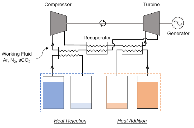 盡管文獻(xiàn)中對(duì)“中溫”的定義不明確,但在這里使用它來指代大約550℃~1,000℃。這些溫度下的熱量可以驅(qū)動(dòng)替代動(dòng)力循環(huán),例如封閉式布雷頓循環(huán),以實(shí)現(xiàn)40%~55%范圍內(nèi)的往返效率。這些循環(huán)可以與顯熱存儲(chǔ)材料(如巖石)或相變材料(如鋁合金)配對(duì)。