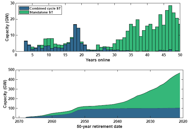 一個(gè)重要的考慮因素是被重新利用的發(fā)電廠的剩余壽命。美國(guó)的汽輪機(jī)發(fā)電廠的平均工作壽命是50年。盡管工廠之間存在基于設(shè)備、操作歷史和維修情況的差異,但這是一個(gè)有用的近似值。使用蒸汽輪機(jī)進(jìn)行儲(chǔ)能可以通過降低利用率和更多循環(huán)來延長(zhǎng)或縮短標(biāo)稱50年的使用壽命。圖4.9上部的圖表顯示了美國(guó)小于50年的汽輪機(jī)裝機(jī)容量的工作壽命。底部的圖表顯示了根據(jù)50年的工作壽命預(yù)計(jì)該容量何時(shí)退役。該圖使用來自美國(guó)環(huán)境保護(hù)署2018數(shù)據(jù)庫(kù)的數(shù)據(jù),并未考慮新增產(chǎn)能。