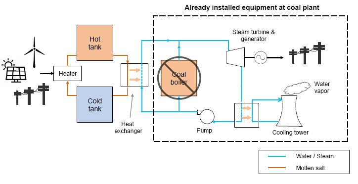 ?通過用儲(chǔ)熱裝置和新的蒸汽發(fā)生器替代現(xiàn)有蒸汽輪機(jī)發(fā)電廠使用的化石燃料和鍋爐,現(xiàn)在可以實(shí)施重新利用現(xiàn)有蒸汽輪機(jī)發(fā)電廠的戰(zhàn)略。