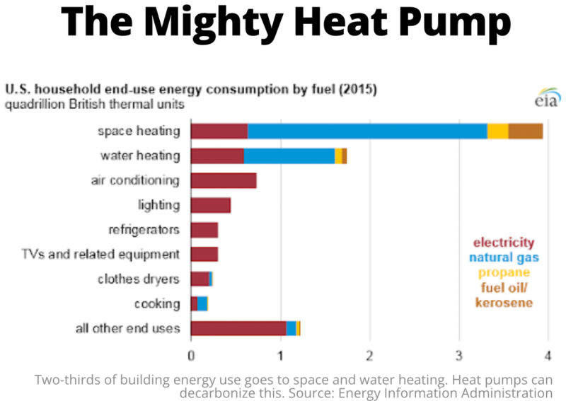 前兩種技術(shù)人所共知,熱泵可能沒有太陽能電池板和電動汽車那么顯眼,但它們同樣重要,有時只占投資成本的一小部分。目前,三分之二的建筑能源用于供暖和熱水,而熱泵消耗的能源是其他技術(shù)的四分之一,并且可以依靠可再生能源產(chǎn)生的電力來運(yùn)行。