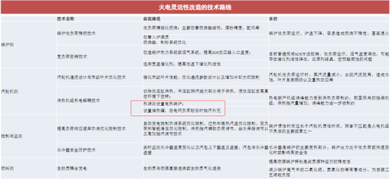 提高火電的深度調(diào)峰能力主要包括三個(gè)路徑:提高鍋爐側(cè)鍋爐低負(fù)荷穩(wěn)燃能力;實(shí)現(xiàn)汽輪機(jī)側(cè)機(jī)組供熱工況熱電解耦;提高機(jī)組主輔機(jī)及其環(huán)保裝置在低負(fù)荷下的設(shè)備適應(yīng)性。由此也產(chǎn)生了多種技術(shù)路線。