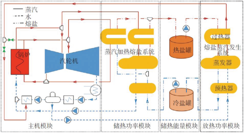 除了工業(yè)蒸汽市場,熔鹽儲能的另一個重要市場為火電靈活性改造,其原理為在火電機(jī)組熱力系統(tǒng)中的“鍋爐汽機(jī)”之間,嵌入大容量高溫熔鹽儲熱系統(tǒng),削弱原本剛性聯(lián)系的“爐機(jī)耦合”,深度調(diào)峰時,保持鍋爐正常運(yùn)行負(fù)荷,汽機(jī)運(yùn)行在低負(fù)荷調(diào)峰工況,鍋爐側(cè)多余高參數(shù)蒸汽熱量被儲熱系統(tǒng)存儲,保證大規(guī)模儲熱和深度調(diào)峰運(yùn)行。