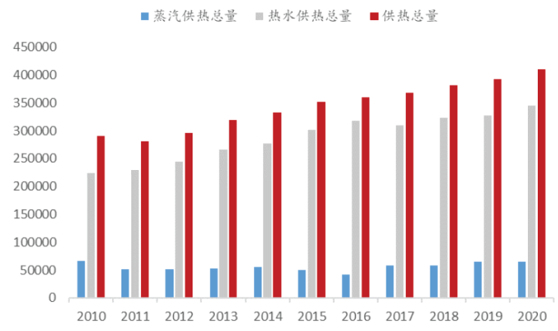 據(jù)國家統(tǒng)計(jì)局?jǐn)?shù)據(jù),2020年,我國城市供熱總量為410058萬吉焦,連年呈持續(xù)上升趨勢,其中,蒸汽供熱量為65054萬吉焦,熱水供熱量345004萬吉焦。