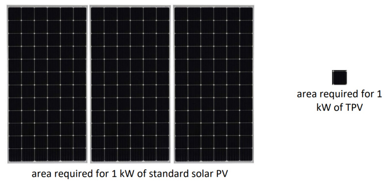 此外,TPV面板較高的能量密度和緊湊型的設計,TPV面積遠小于傳統(tǒng)光伏發(fā)電面板。