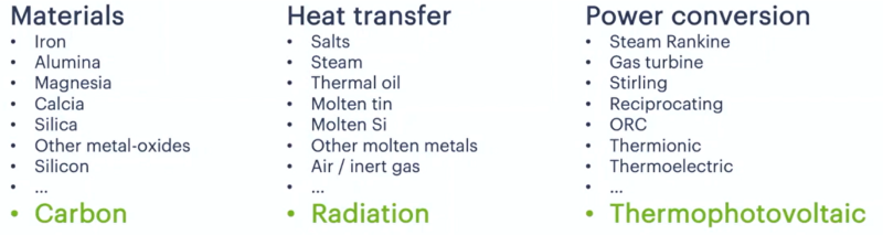 Antora Energy公司的定位是發(fā)展長時儲能以滿足未來大規(guī)模新能源接入對電網(wǎng)帶來的調(diào)節(jié)不足的問題,同時立足于現(xiàn)有儲能技術(shù)經(jīng)濟造價過高,尤其是長時間儲能價格翻倍的問題。因此該公司從三個方面破局,一是儲熱介質(zhì),尋找低造價、高能量密度的儲熱介質(zhì);二是熱傳遞的方式,尋找簡單可靠的熱傳導方式;三是熱電轉(zhuǎn)換,尋找可行的熱-電轉(zhuǎn)換技術(shù)。通過大量的市場調(diào)研、技術(shù)分析論證,最后采用下圖所示的技術(shù)方案,儲熱介質(zhì)采用碳塊、熱傳遞方式采用光輻射、發(fā)電方式采用光熱發(fā)電。