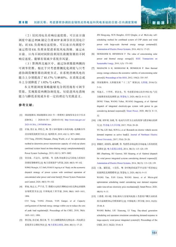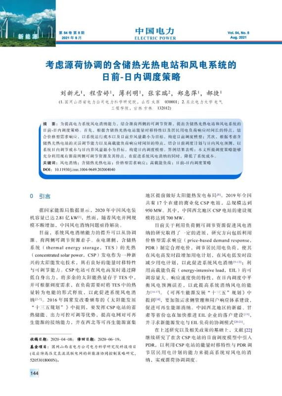 劉新元, 程雪婷, 薄利明, 等. 考慮源荷協(xié)調(diào)的含儲熱光熱電站和風電系統(tǒng)的日前-日內(nèi)調(diào)度策略[J]. 中國電力, 2021, 54(8): 144-153.