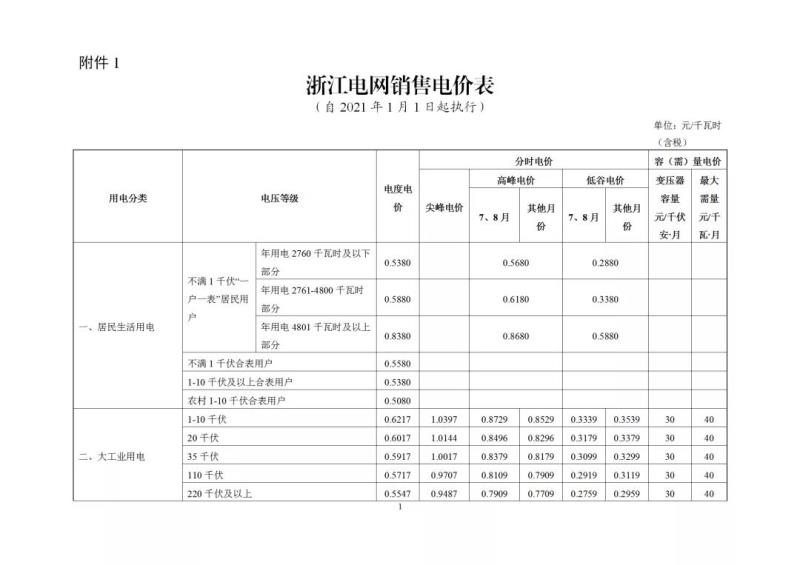 浙江:2021年1月1日起,浙江省大工業(yè)平均銷售電價(jià)預(yù)計(jì)將較2019年下降每千瓦時(shí)5.2分。大工業(yè)用電1-10千伏、20千伏、35千伏、110千伏、220千伏及以上各電壓等級(jí)低谷電價(jià)每千瓦時(shí)將分別下降6.25分、6.25分、6.25分、6.05分、7.25分。同時(shí),7、8月份各電壓等級(jí)低谷電價(jià)在上述降價(jià)基礎(chǔ)上再下調(diào)2分錢。政策實(shí)施后,預(yù)計(jì)年減輕我省大工業(yè)用戶用電成本約115億元,為促進(jìn)我省制造業(yè)高質(zhì)量發(fā)展?fàn)I造良好環(huán)境。