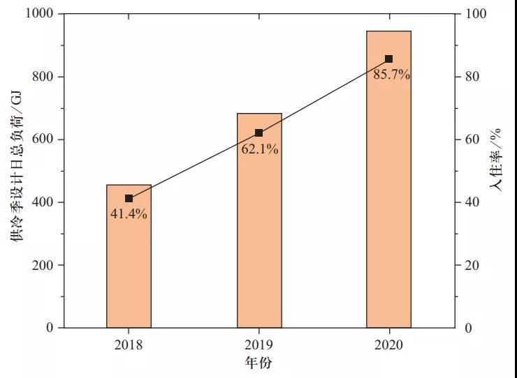 將冷熱負(fù)荷二者綜合來(lái)看,該年內(nèi)能源站所需承擔(dān)的峰值冷熱負(fù)荷約占設(shè)計(jì)冷熱負(fù)荷的65%。這一方面說(shuō)明為保證設(shè)備容量的裕度,設(shè)計(jì)冷熱負(fù)荷往往會(huì)選取偏大;另一方面,該結(jié)果也從側(cè)面反映出新建建筑因入住率不足導(dǎo)致實(shí)際用能水平相較預(yù)測(cè)值偏低的情況。為了進(jìn)一步探究“入住率”的變化情況,本文根據(jù)計(jì)量數(shù)據(jù)得出全部3個(gè)年份供冷季設(shè)計(jì)日的總冷熱負(fù)荷實(shí)際值,并依次對(duì)比預(yù)測(cè)值,將該比值視為當(dāng)年建筑群的“入住率”,。
