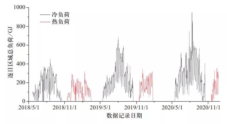 在本項(xiàng)目投產(chǎn)運(yùn)行后,出于運(yùn)營(yíng)管理的需要,能源站利用其機(jī)房的節(jié)能控制系統(tǒng)對(duì)供能過(guò)程中的部分關(guān)鍵數(shù)據(jù)(冷熱水干管的流量、供回水的溫差)進(jìn)行計(jì)量。在實(shí)際操作中,是由工作人員在每日固定時(shí)段執(zhí)行“抄表”操作來(lái)實(shí)現(xiàn)數(shù)據(jù)計(jì)量工作的,記錄從上一個(gè)“抄表”時(shí)刻到當(dāng)前時(shí)刻能源站供給的累計(jì)冷熱量,相當(dāng)于記錄了區(qū)域內(nèi)建筑群的逐日總冷熱負(fù)荷。如圖3所示,已記錄數(shù)據(jù)涵蓋了從項(xiàng)目開始投產(chǎn)(2018年5月)至2021年1月的全部供能系統(tǒng)運(yùn)行日(即系統(tǒng)進(jìn)行檢修的時(shí)段除外)的實(shí)際冷熱負(fù)荷。