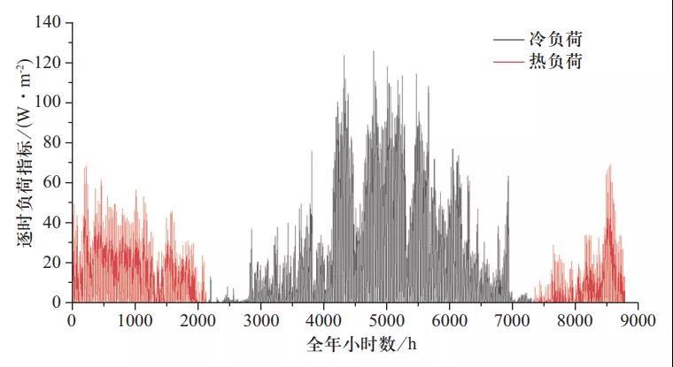 通過(guò)在全年尺度上的模擬計(jì)算,能夠得到各類型建筑逐小時(shí)的單位面積冷熱負(fù)荷指標(biāo)。根據(jù)規(guī)劃階段的實(shí)際需求,為本項(xiàng)目中能源站提供了其供能區(qū)域全年的逐時(shí)冷熱負(fù)荷指標(biāo)(如圖2所示),并將其總負(fù)荷的峰值作為該區(qū)域供能系統(tǒng)的冷熱負(fù)荷設(shè)計(jì)值,用以指導(dǎo)項(xiàng)目建設(shè)中的設(shè)備選型工作。