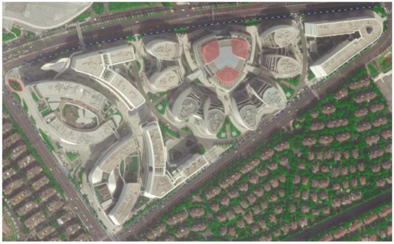上海西虹橋1號(hào)能源站于2018年年初建成并投產(chǎn)。目前,該能源站為其規(guī)劃區(qū)域內(nèi)占地面積約為160 hm2的大型建筑群供能。該項(xiàng)目是集商業(yè)、餐飲、辦公于一體的大型城市綜合體,其中包括了辦公、集中商業(yè)、街區(qū)商業(yè)等在內(nèi)的多棟單體建筑,功能綜合性較強(qiáng),建筑群衛(wèi)星圖如圖1所示。